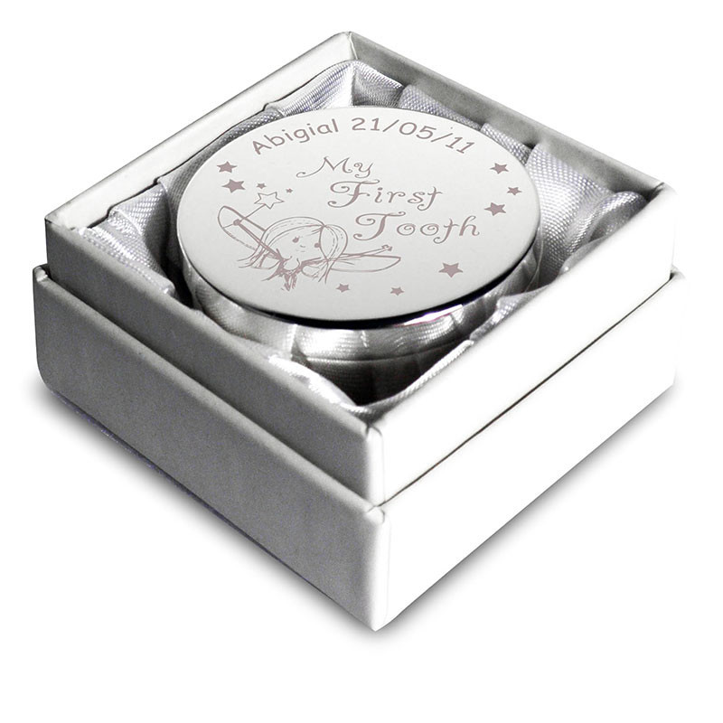 Mark the enchanting occasion of your little one losing their first tooth by keeping it in this lovely My First Tooth Box. The friendly fairy on the top is perfectly poised to swap teeth for money and you can make it extra special with a personalised message of up to 20 characters. This silver plated box looks stunning sat on a shelf in a nursery or child's bedroom and makes a super thoughtful present.