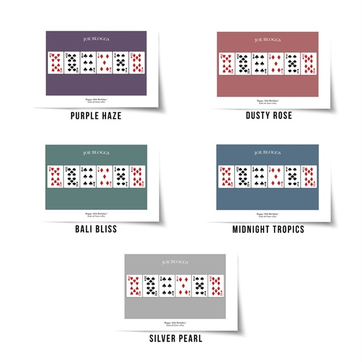 The face value of the playing cards totals 50, so it's ideal for a 50th birthday or perhaps a golden anniversary. This unique personalised poster comes in a choice of five background colours and is available in A4 or A3. It can also be framed for an extra charge and looks great as an eye catching piece of wall art. Its subtle design is stylish and colourful and is sure to brighten any room at home or in the office. Select the name of the person you want to be printed at the top of the poster and also dedicate a personal message (up to 50 characters) such as 'Happy 50th Birthday' or '50th Wedding Anniversary'. This unusual playing cards wall art makes a special gift that will be remembered and remarked upon for years to come.