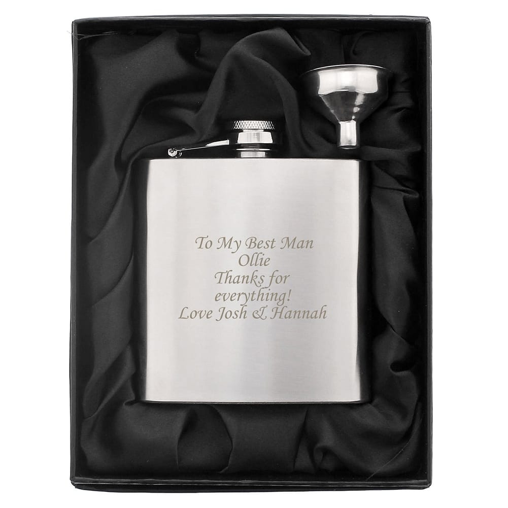 Each of our custom etched hip flasks are made from gloriously shiny stainless steel and arrive packaged along with a funnel in a fantastic presentation box. They can be engraved with a message up to 100 characters in length spread out over 5 lines. Our personal engraved hipflasks are beautifully styled and make a timeless keepsake and a wonderful gift for any occasion. Whether they're celebrating their 18th birthday or their retirement, an engraved hip flask is sure to be a hit.