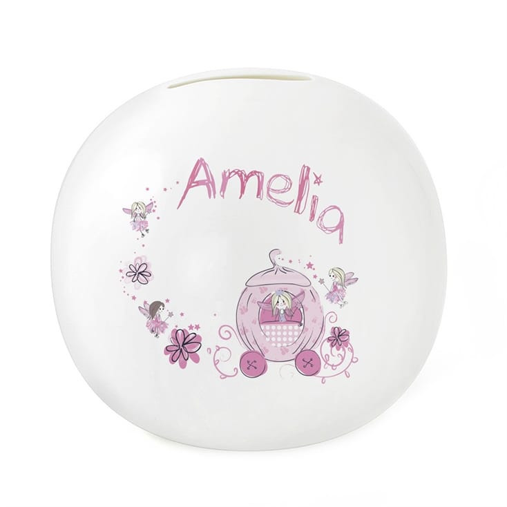Fairy money boxes are a wonderful fairy-tale gift for young children. The delicate design features a fairy in a pumpkin carriage, with a trail of flowers and fairies leading to your recipients name above. Such a dainty motif will encourage any little girl to save her pennies in this gorgeous money bank. The ultimate magical gift, this Fairy Money Box will aid any fairy princess in her quest to save for her first set of wings.