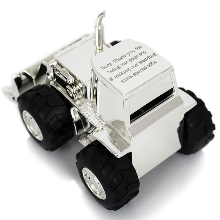 This Silver Tractor Money Box is simply any young boys dream! As well as being an ingenious money box, it also has moving wheels and a digger spade! The top can be personalised with up to 80 characters which makes it the perfect memorabilia for any Birthday, Christmas or Christening present.